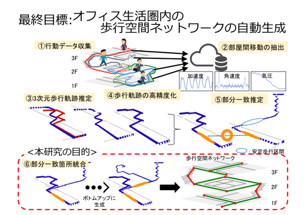 屋内において,ナビゲーションに代表される位置情報サービスの実現には建物構造情報が必要です. しかし,構造情報生成のための機器や作業コストが問題であり,あらゆる建物において必ずしも存在するとは限りません. そこで我々は,複数人のスマートフォンのセンサと既存インフラのみを用いた生成を目指しています. これまでに,センサ信号の変化が少ない状態が継続する区間(安定歩行区間)に着目した,歩行軌跡の推定や複数軌跡における部分一致箇所の推定を行いました. 本研究では,部分一致箇所をボトムアップに統合するための初期段階として,軌跡のノードリンク化,統合する軌跡の選択,統合位置の決定手法の基礎検討を行いました.