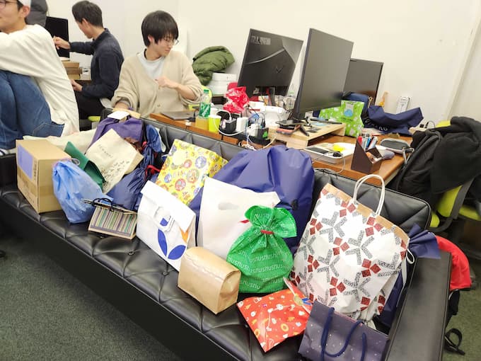 プレゼント交換会も行いました. プレゼント交換会では各々がプレゼントを持ち寄り、ビンゴを行い2ビンゴした人からそれぞれ好きなものをとっていくというシステムでした. 皆決められた予算の中から様々なプレゼントを用意していて開ける瞬間までドキドキが止まらなかったです.(多分)