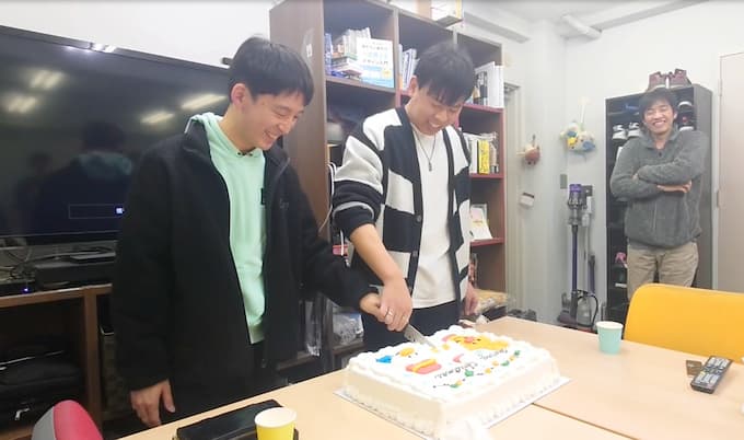 今年のクリスマス会兼忘年会は、コストコでケーキやチキンなどを買って皆で食べ、その後ゲームなどをして盛り上がりました. コストコのケーキを切り分ける際、院進の儀と言うことで今回参加していた院進予定の2名がケーキ入刀(?)を行いました.