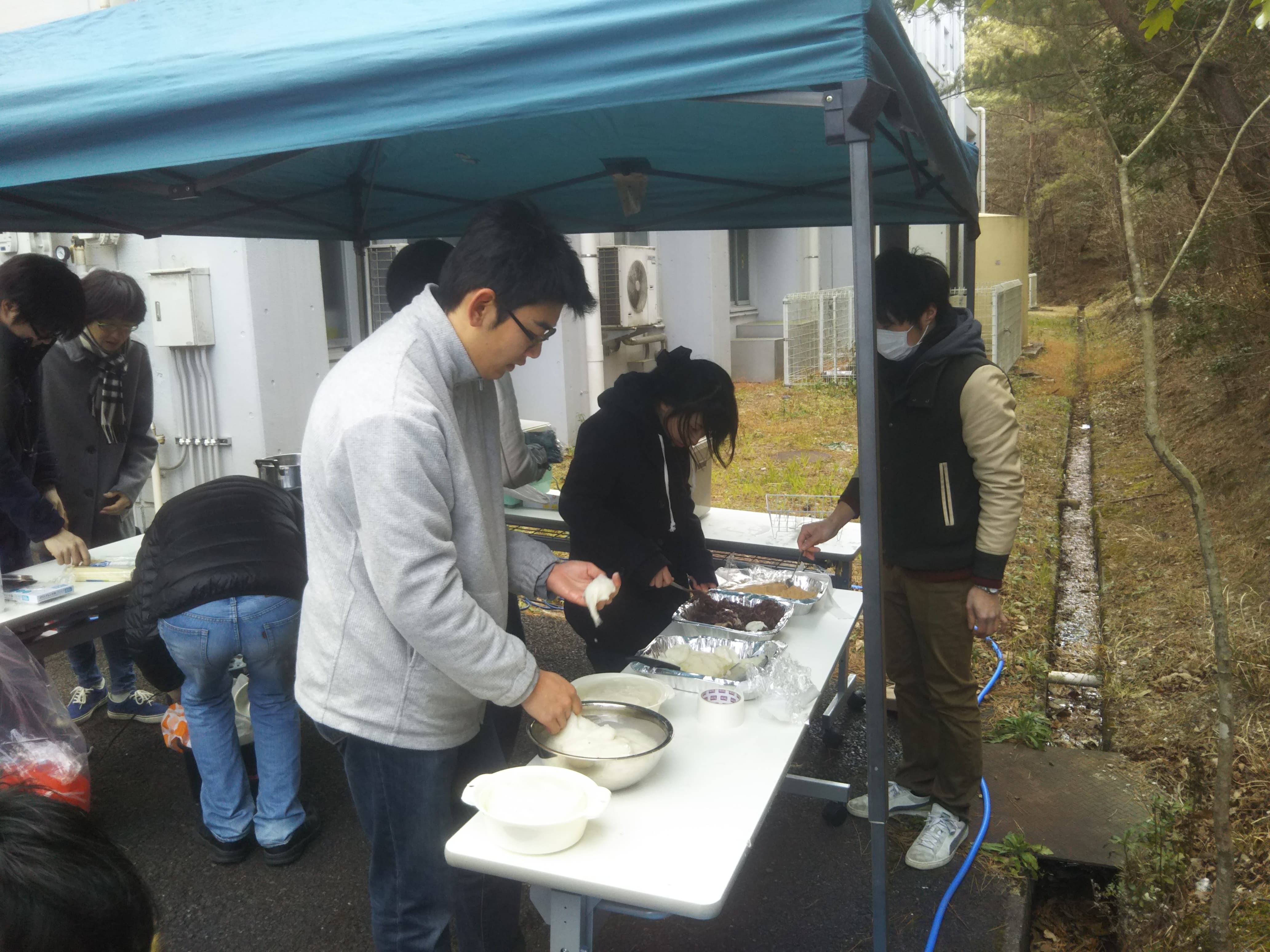 2017年2月7日,忘年会で出ていた「餅つき大会をしよう!」という案が現実になりました. 今回は梶研メンバー18名と,内藤研メンバー10名の総勢28名という,規模が大きめのイベントとなりました. きなこ,あんこ,大根おろしの三種類の味付けが用意され,皆賑やかに食べていました.(きなこ舞い,味の可能性を見出す…)