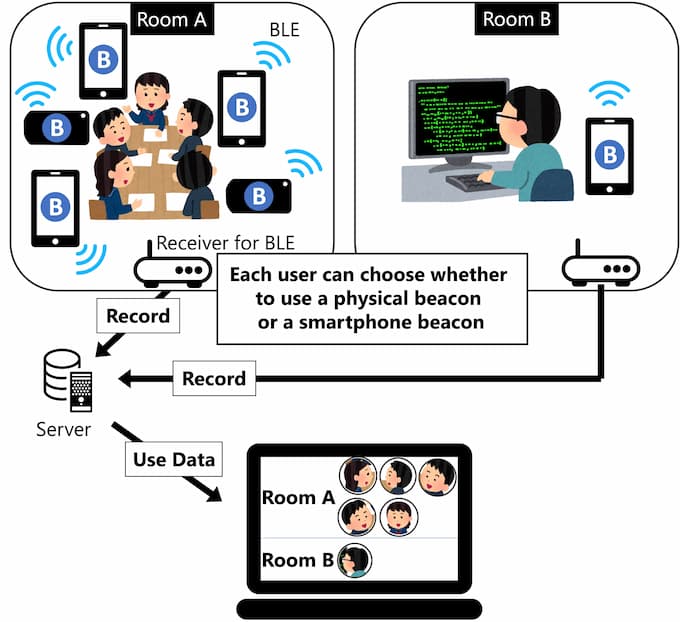 人は1日の88.9%を屋内で過ごし,屋内では主に自室や研究室,会議室のような部屋という物理的に区切られた空間で活動する.そのため高精度な位置情報に限らず部屋単位の位置情報にも価値がある.我々は各ユーザの携帯する BLE ビーコンからの電波を環境に設置した受信機で受信し部屋推定を行う滞在管理システムを提案してきた.しかしBLE電波を発信する専用端末のみを用いるこれまでの方法は,電池交換や初期設定の手間,ユーザがBLEビーコンを持たないで部屋を移動するなどの問題があった.本研究では追従性が高く初期設定や電池交換の手間がかからずバッテリ消費の少ないスマートフォンビーコ ンを実装,評価する.初期設定の手間を減らすためサーバからユーザのUUIDを取得し,バッテリ消費を少なくするため定期的なネットワーク通信を伴わないBLE電波を発信し続けるアプリケーションを実装した.評価実験で,追従性が高くバッテリ消費が小さいという評価が得られた.