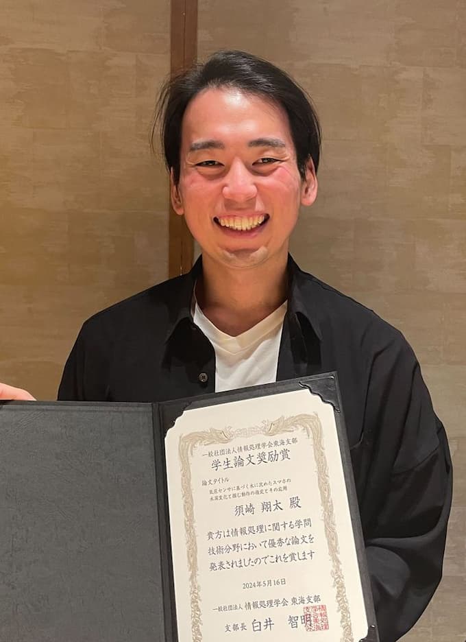 2024年3月に大学院博士前期課程を修了した須崎翔太さんが,論文「気圧センサに基づく水に沈めたスマホの水深変化と掴む動作の推定とその応用」により、情報処理学会東海支部の2023年度学生論文奨励賞を受賞しました.