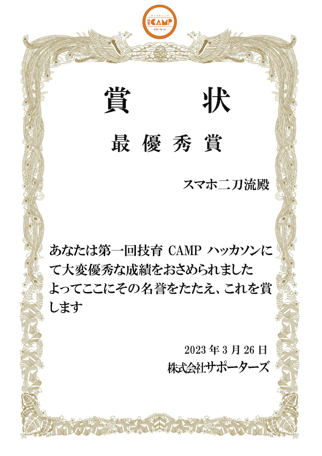 今回がハッカソン初参加かつ、インターンシップと時期が被ってしまいかなり大変でした。しかし、チームのおかげで無事に完成し最優秀賞を受賞できたので参加し て良かったと思います。