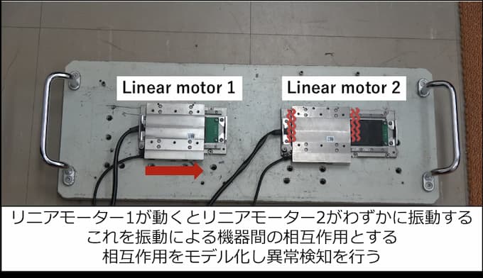 Machine learning is being investigated as a promising method for detecting anomalies. Studies have proposed a method for detecting anomalies in equipment by searching for data that identifies equipment anomalies by arranging sensors in the equipment. However, this method requires a large number of sensors and is, therefore, expensive to purchase and install. In this research, we introduce a less costly method that does not use a large number of sensors. Factory Automation (FA) involves a lot of equipment and, when in operation, the machines are affected by the interaction between this equipment, specifically, the sounds, vibrations, and heat. We believe it is possible to detect equipment anomalies and reduce cost by modeling the vibrations caused by this interaction when the equipment is in its normal state and comparing it with its anomalous state. In this study, we collected normal and anomaly data, modeled interaction, and conducted evaluation experiments. We used the coefficient of determination for anomaly detection to compare the normal data model with the anomaly data.