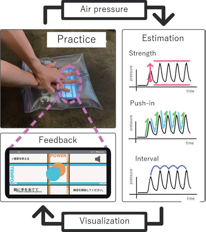 Mizukusa, M., Kaji, K: Cardiac Massage Practice Application using Barometer in a Smart Phone and Sealed Bag, Adjunct Proceedings of the 2023 ACM International Joint Conference on Pervasive and Ubiquitous Computing & the 2023 ACM International Symposium on Wearable Computing, pp.451–456, 2023. https://doi.org/10.1145/3594739.3610737