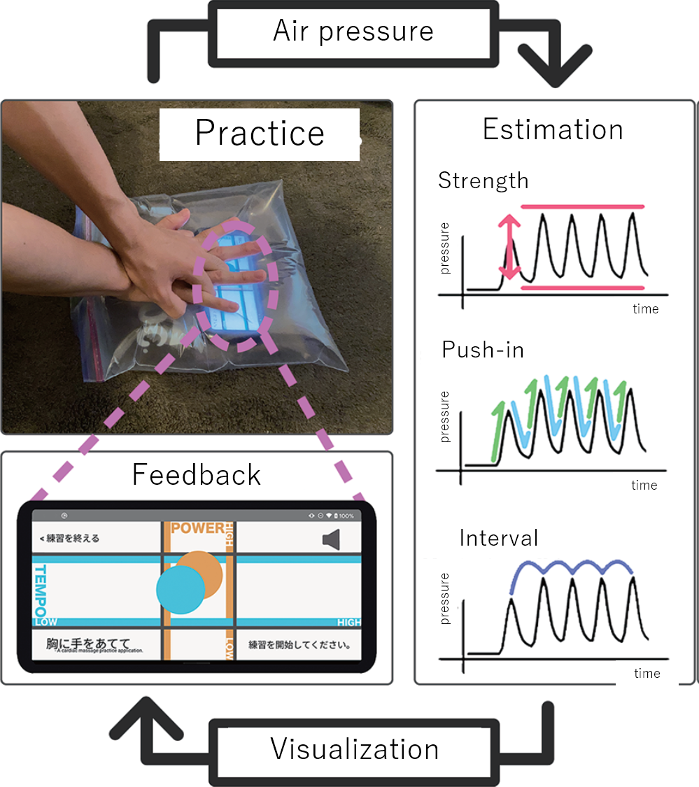 Mizukusa, M., Kaji, K: Cardiac Massage Practice Application using Barometer in a Smart Phone and Sealed Bag, Adjunct Proceedings of the 2023 ACM International Joint Conference on Pervasive and Ubiquitous Computing & the 2023 ACM International Symposium on Wearable Computing, pp.451–456, 2023. https://doi.org/10.1145/3594739.3610737