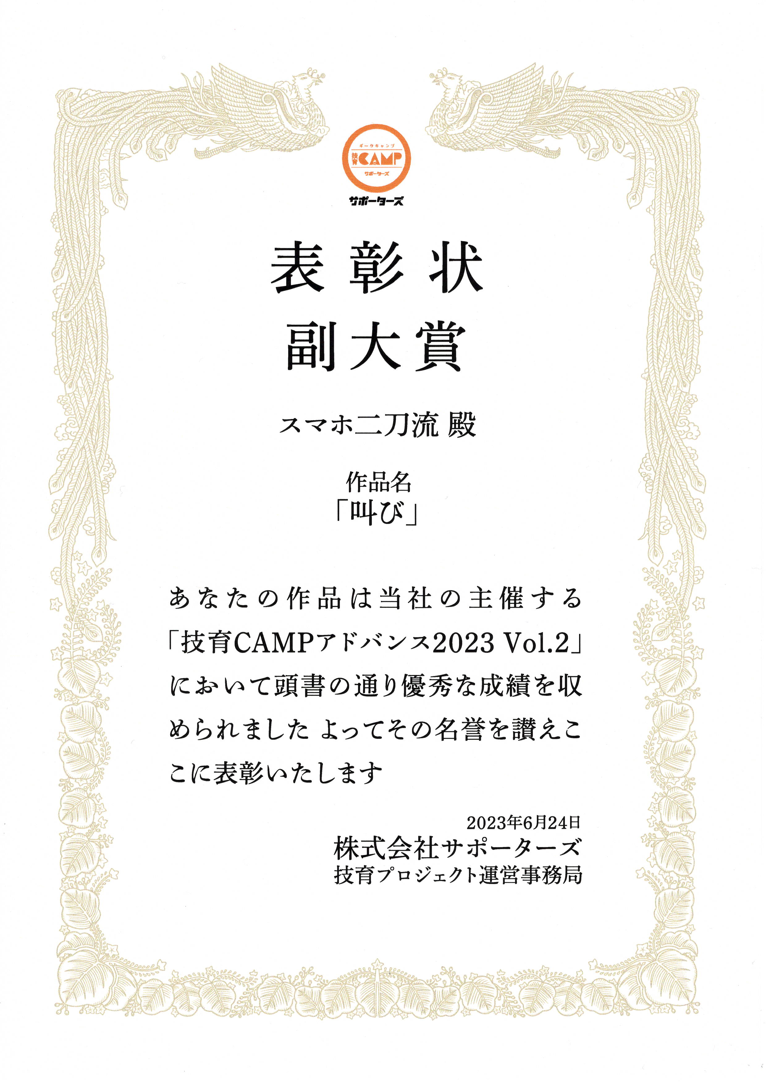 技育CAMPアドバンスというレベルの高い場で発表し、賞を受賞でき嬉しく思います! スケジュール的に厳しい場面もありましたが、ちゃんと発表できて良かったです。
