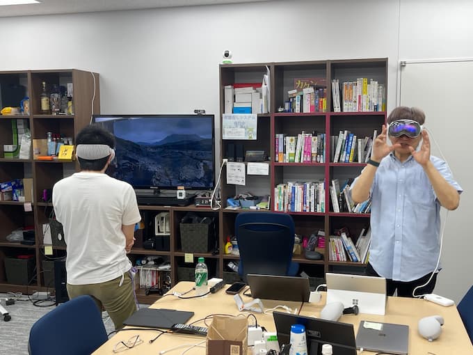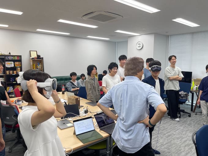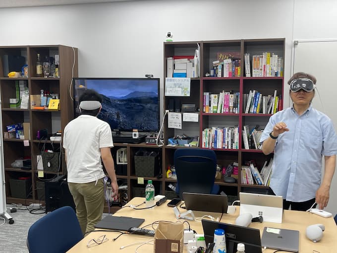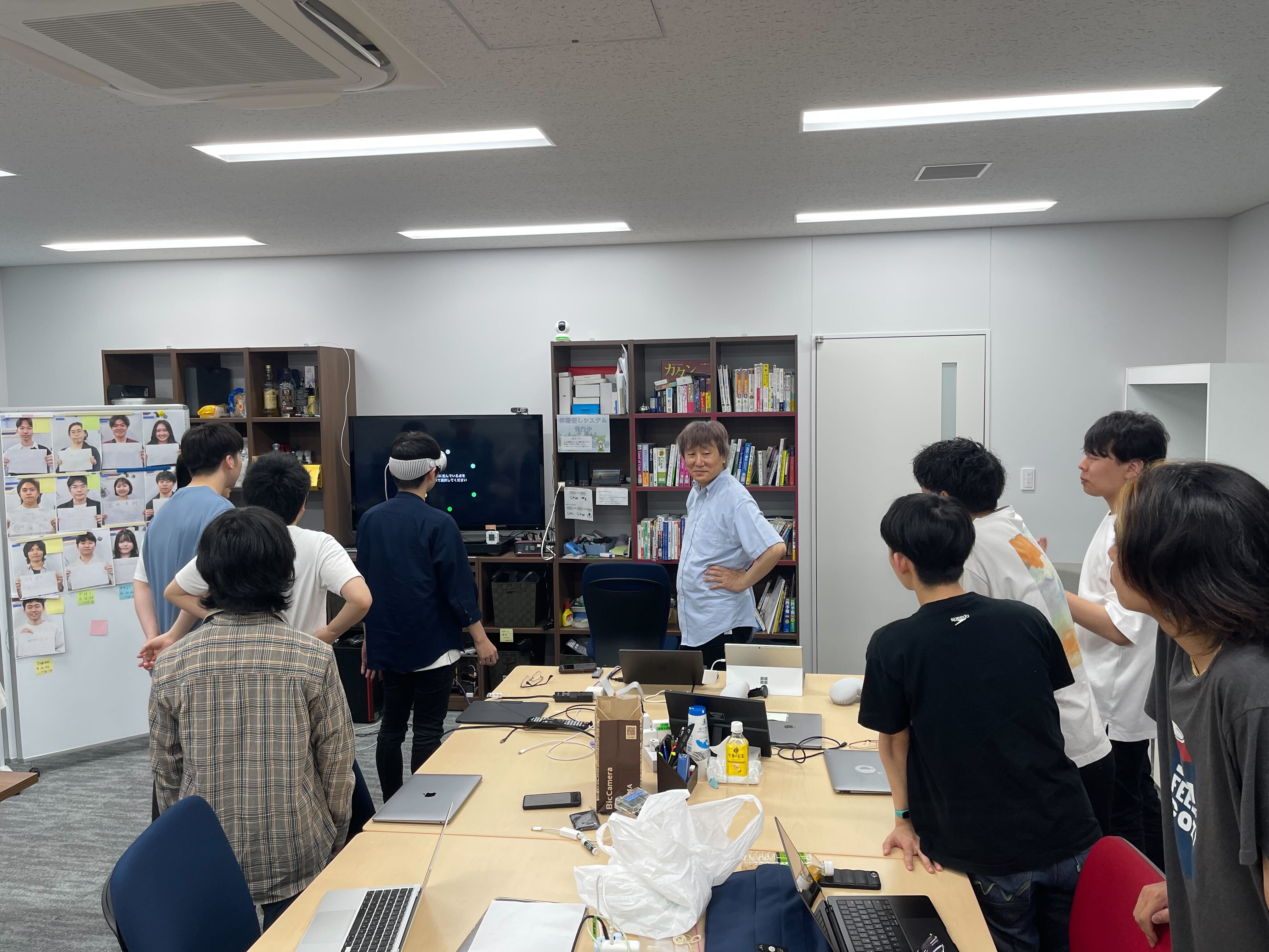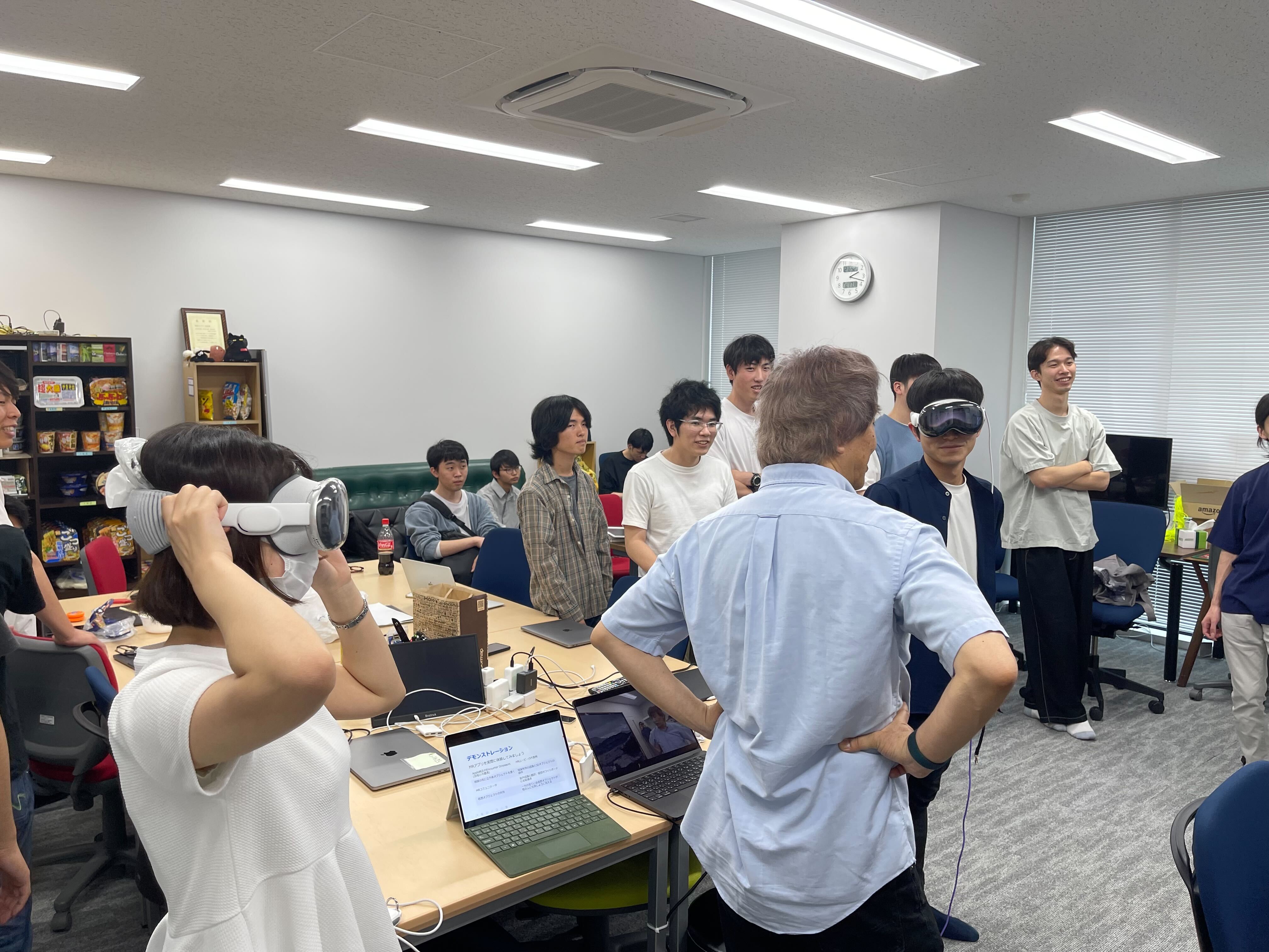6/17に名古屋大学から長尾先生が来ていただき,MR(複合現実)研究についてのお話をしていただきました. VisionProを実際に体験してもらう時間もあり,MRのリアルさに皆驚いたりして楽しんでいました. 長尾先生は梶先生の名古屋大学時代の担当教授でもあるそうです.