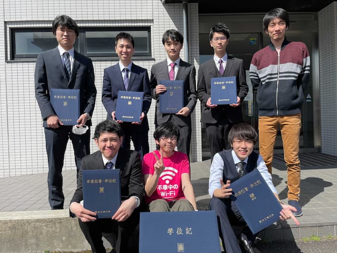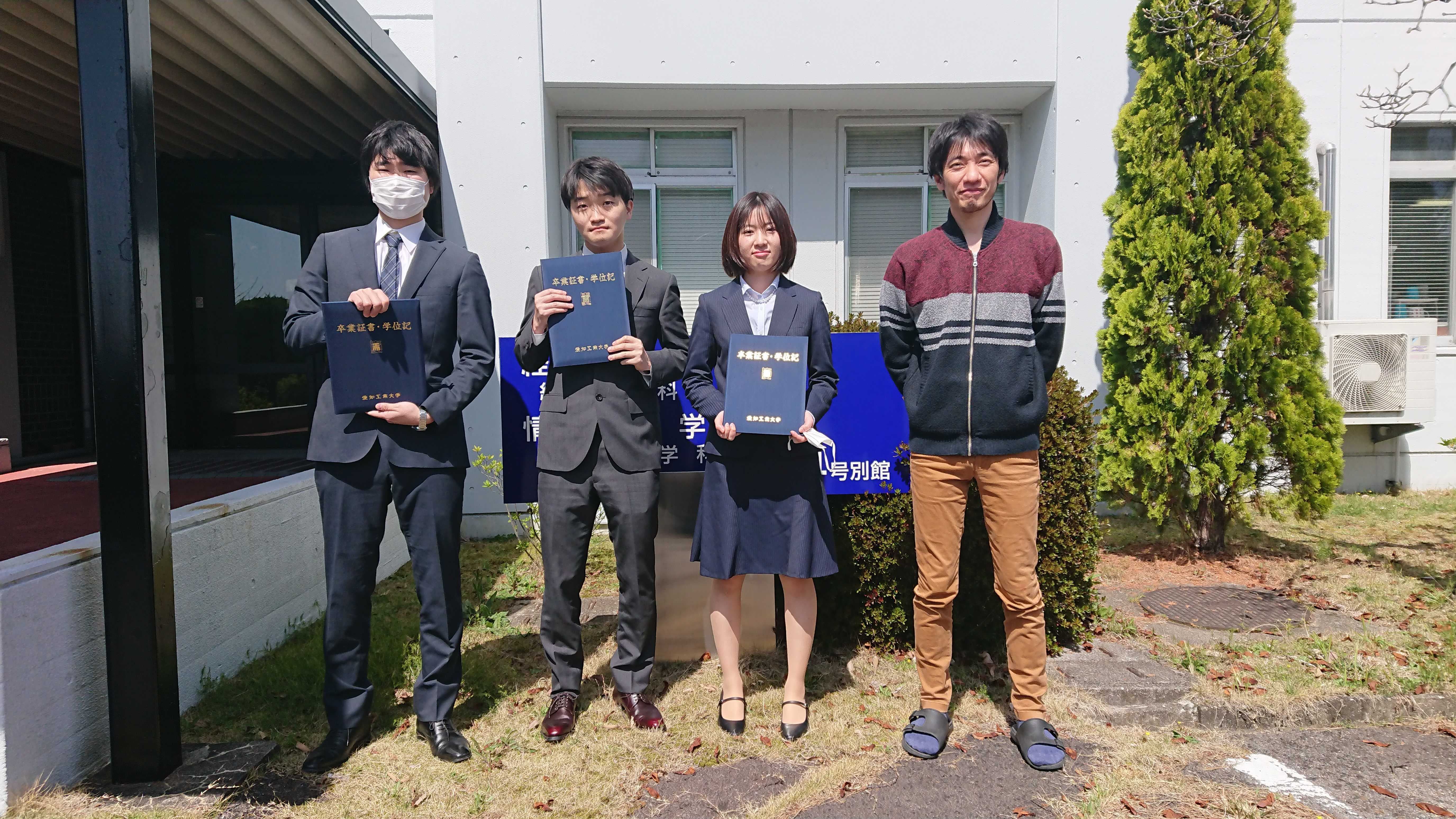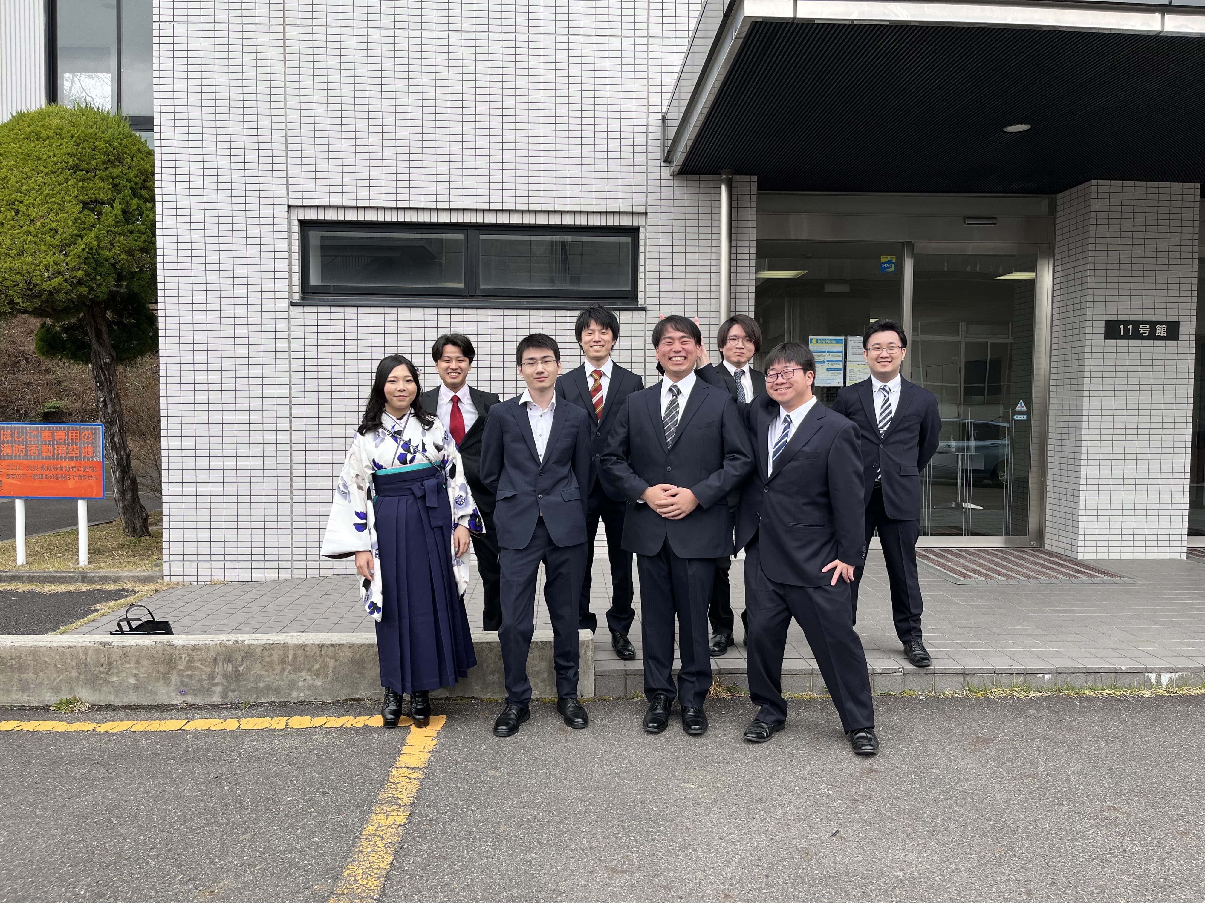 今年は学部4年生(10)人のうち,2人が大学院進学で,8人が就職となりました. 卒業式は中止やオンライン開催にする大学が多い中,本学では学科ごとではありますが対面で開催され,最後にメンバー全員集まることができました.