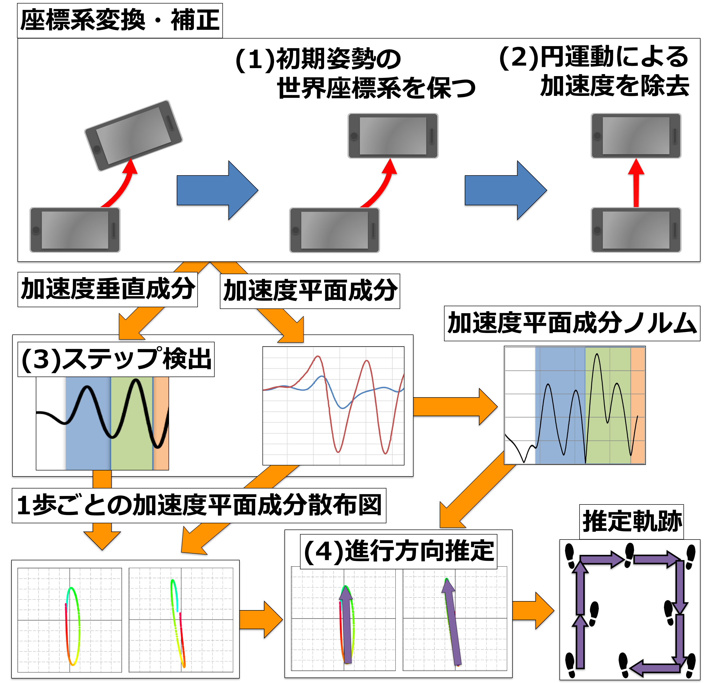 - 横歩きや後退を含む歩行のための加速度と角速度の平面成分を併用した進行方向推定に関する研究