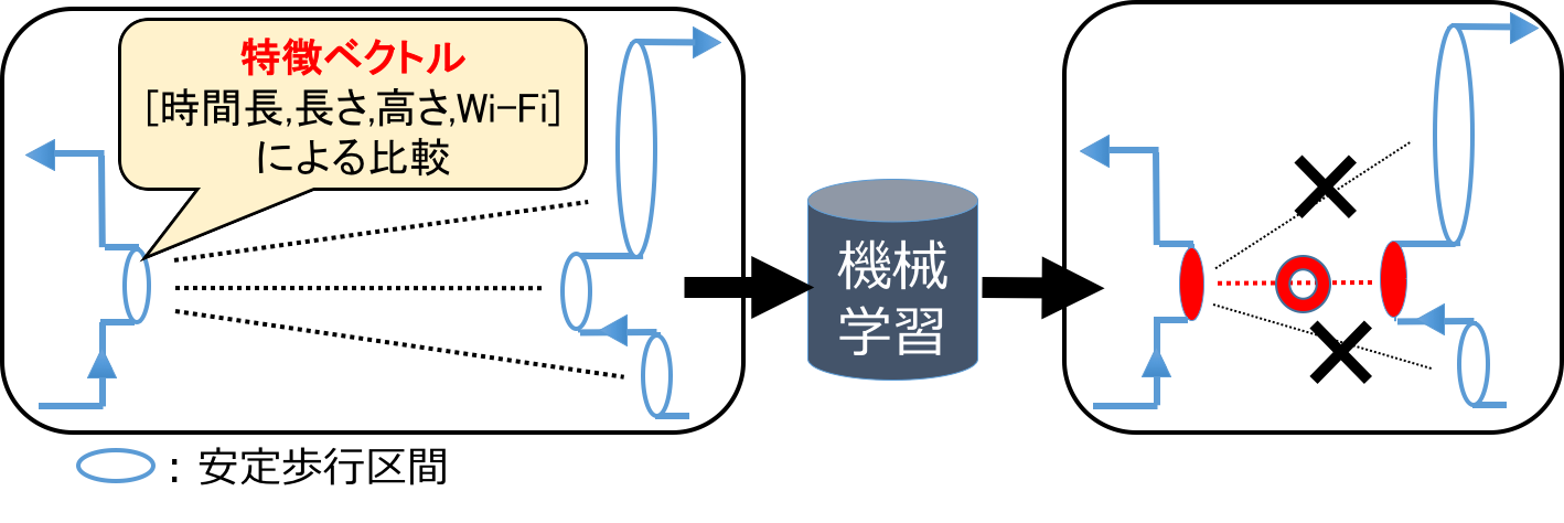 - アプローチ1:センシングデータの安定性に基づいた信頼性の高い歩行軌跡の選択