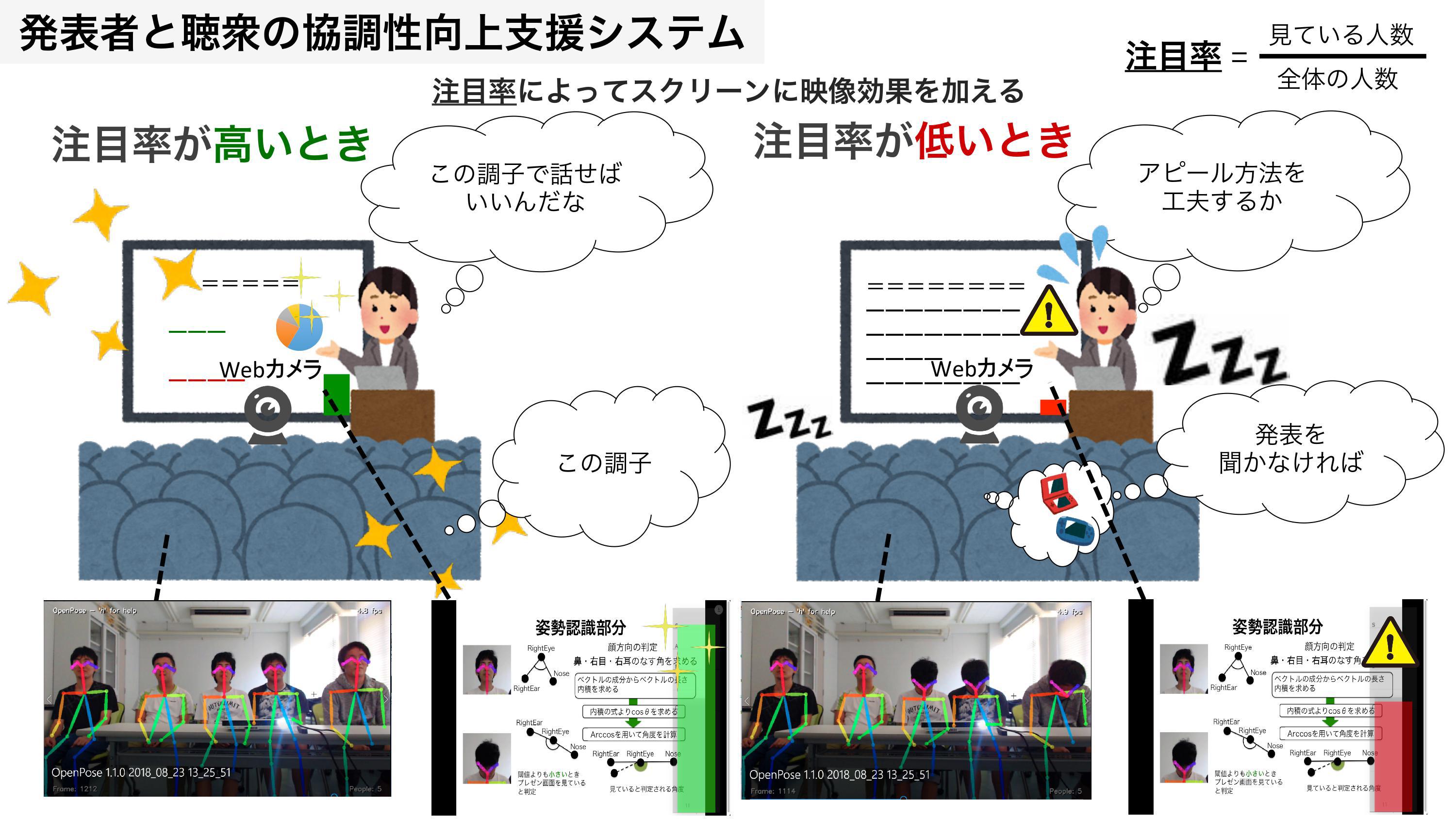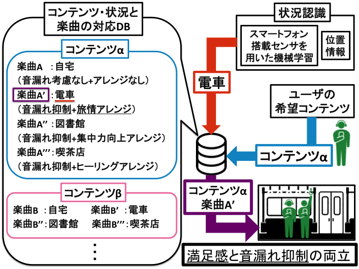 スマホの普及や高機能化・携帯ゲーム機の普及などに伴って,様々なコンテンツがモバイル環境で楽しめる様になってきました. しかし反面,歩きスマホ・運転中スマホなどによる危険性,イヤホンからの音もれなどによる迷惑性が問題となってきています. 人は利己的なもので,これらはマナー啓蒙やルール縛りでは根本解決にはなりません. 本プロジェクトでは,センサによる環境認識技術をベースに,コンテンツを適応的に変化させ,コンテンツを楽しむ満足度を下げることなく,同時に危険・迷惑性を低減する手法について検討しています. 例えば歩きスマホしているときには弾幕無理ゲーにして自然に歩かなくさせたり,電車乗車中にはゲーム内のBGMや効果音を音もれしにくいものに差し替える等です.