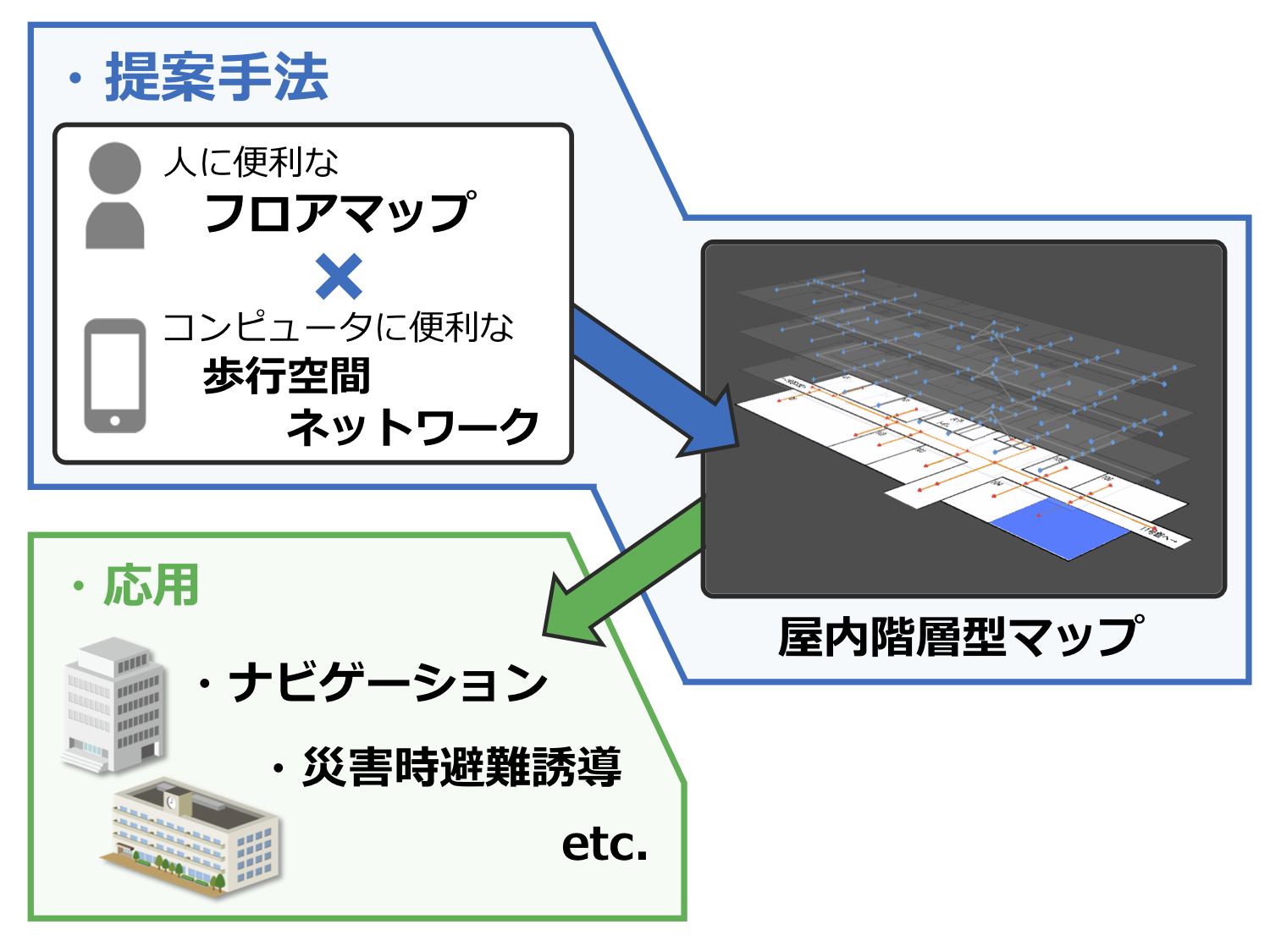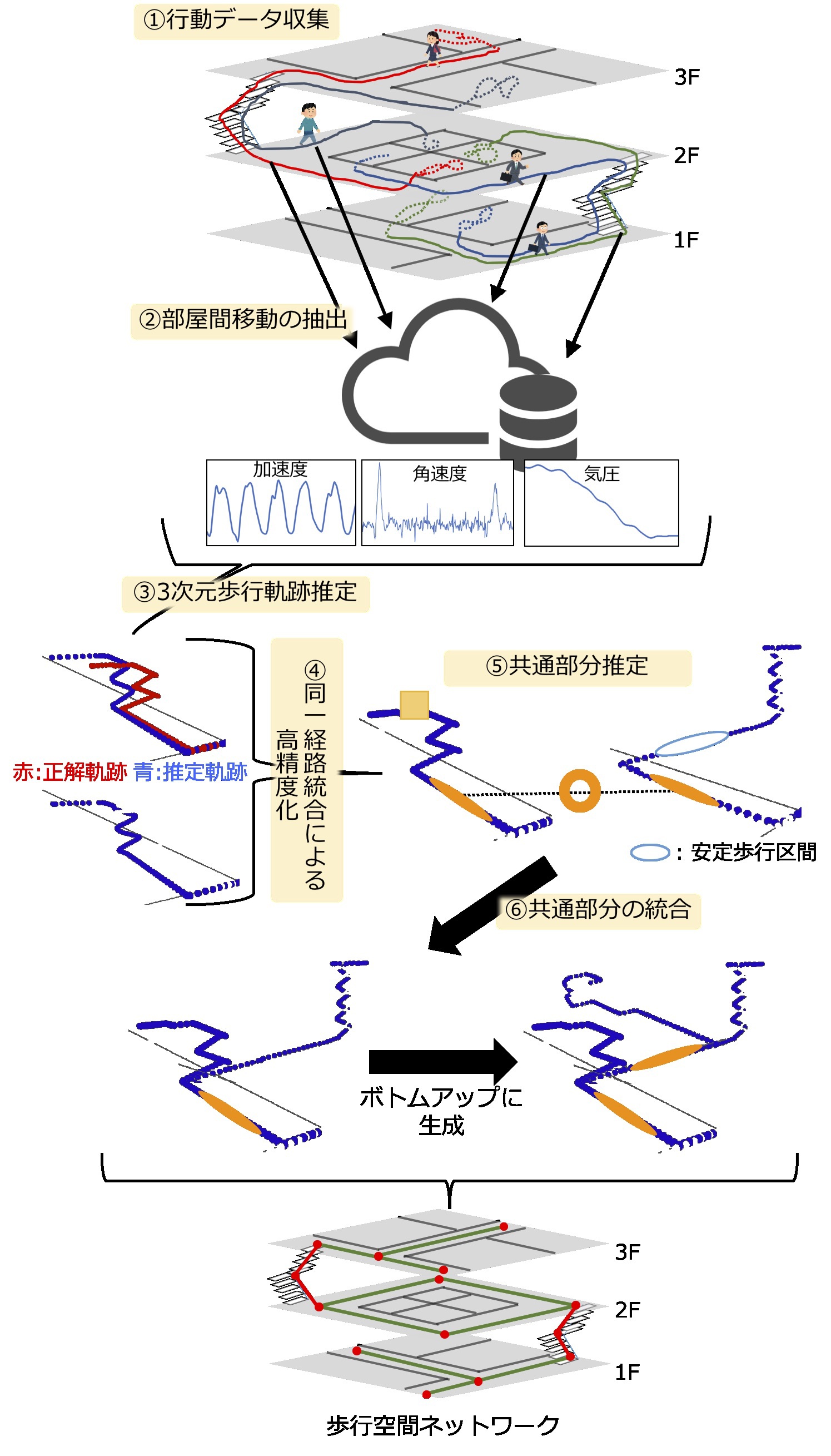 屋外のようにGPSを利用できない屋内において,スマホ保持者の位置を推定する研究プロジェクトです. 環境に設置されたWi-Fi/BLEビーコンといった電波や残留磁気を用いたり,スマホに搭載されているセンサから相対的な移動を推定したり,その併用によって位置を求めます. 屋内歩行センシングデータを収集・統合して建物構造を生成するという研究も行っています.