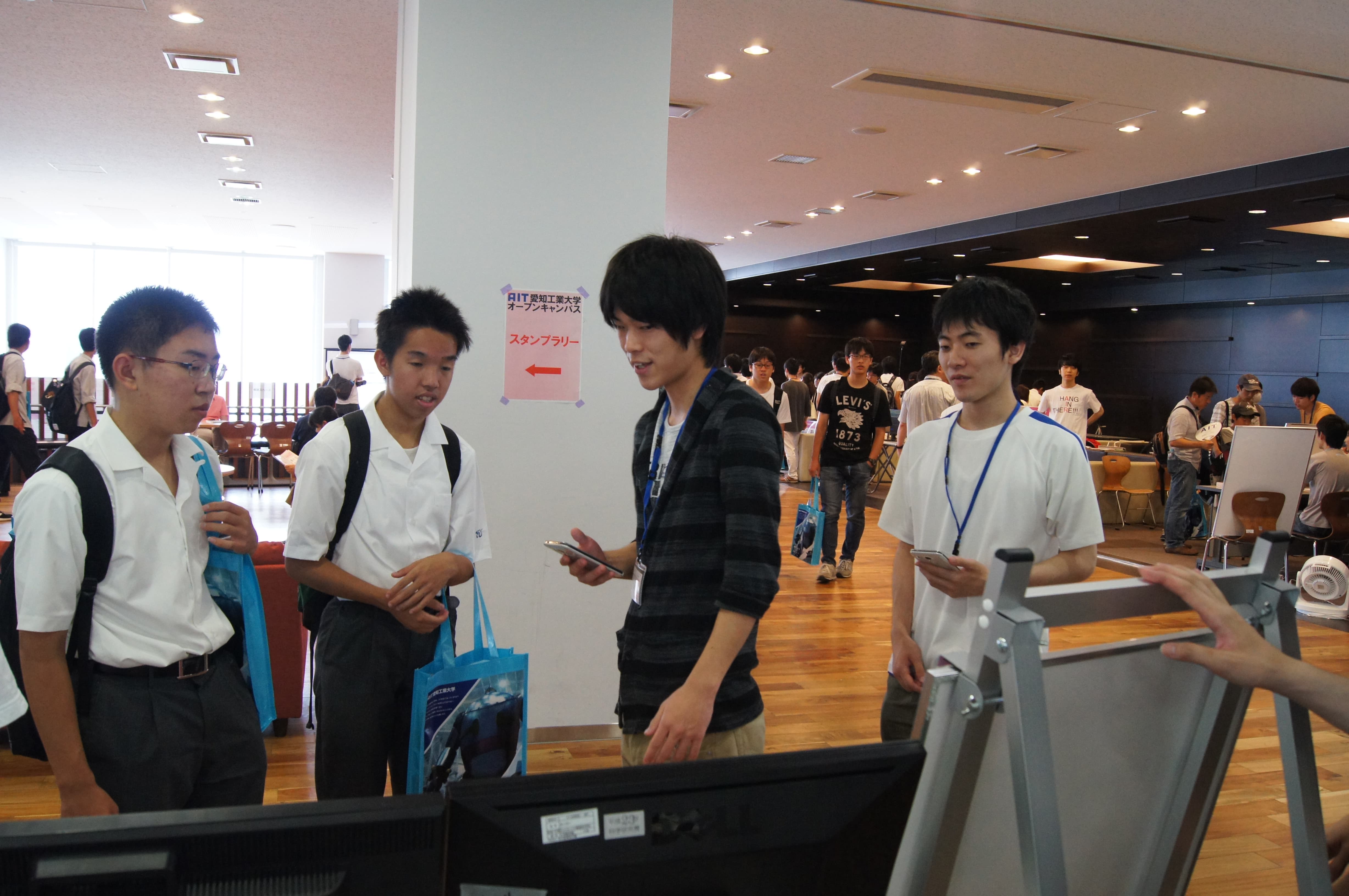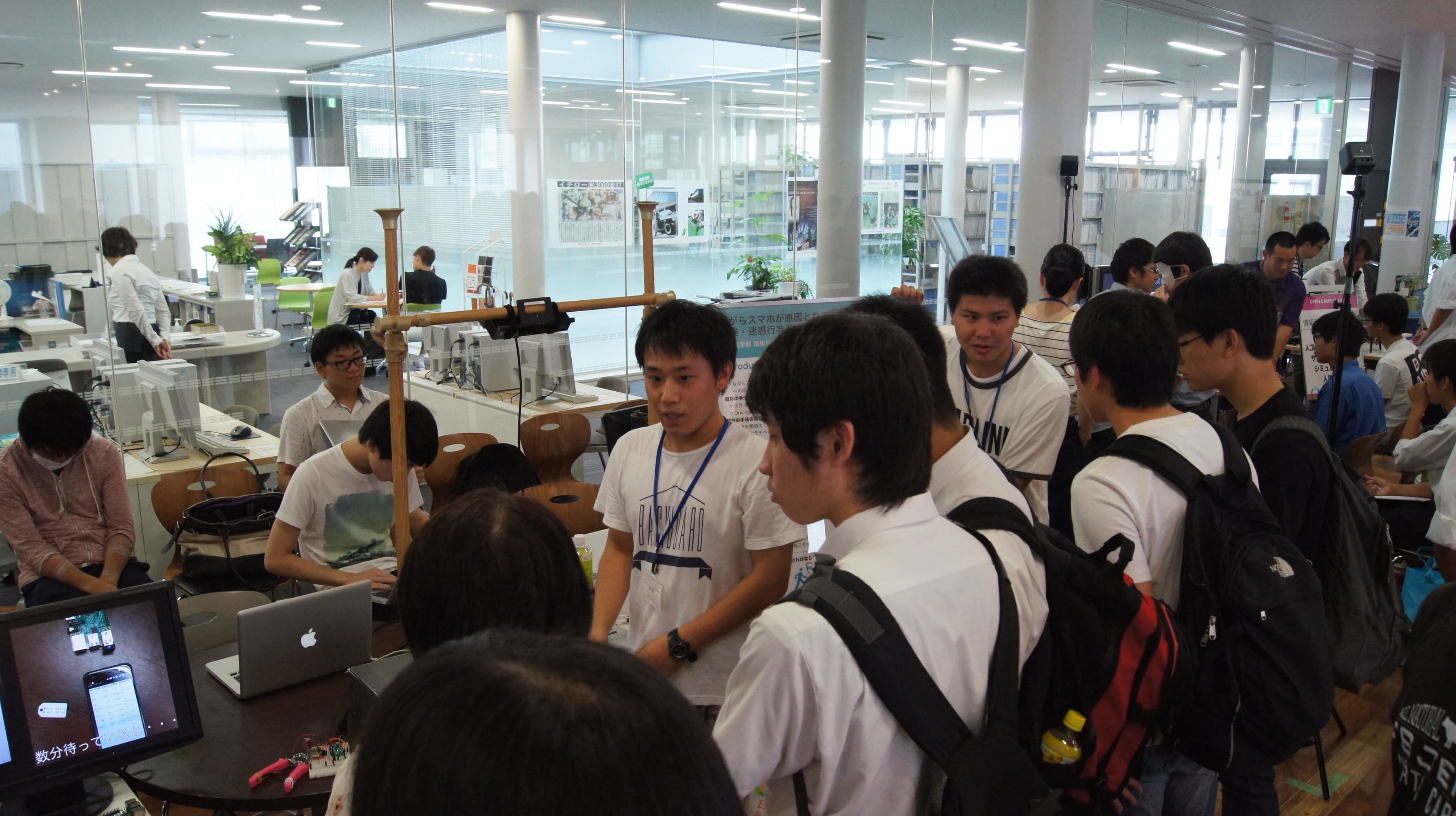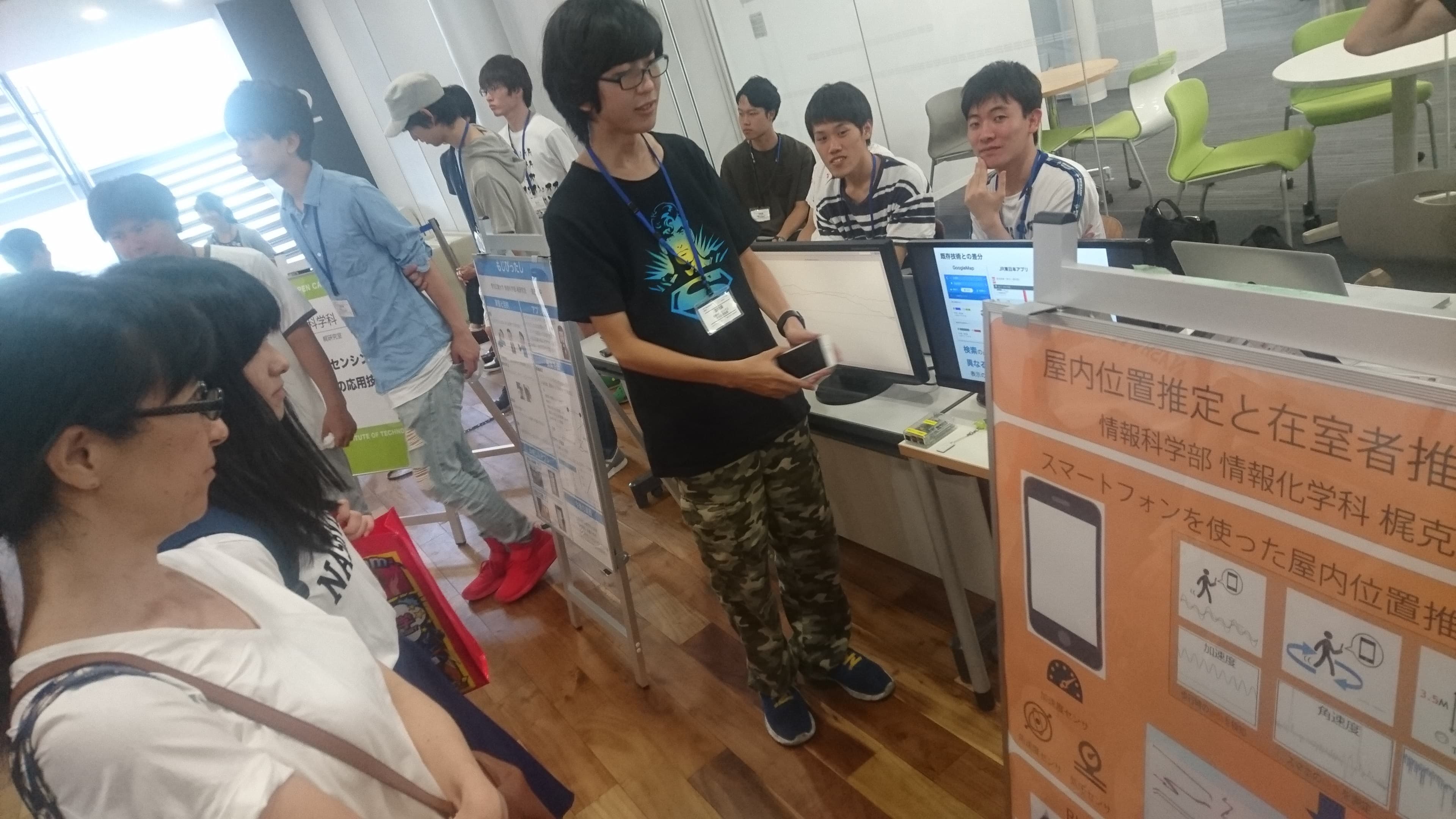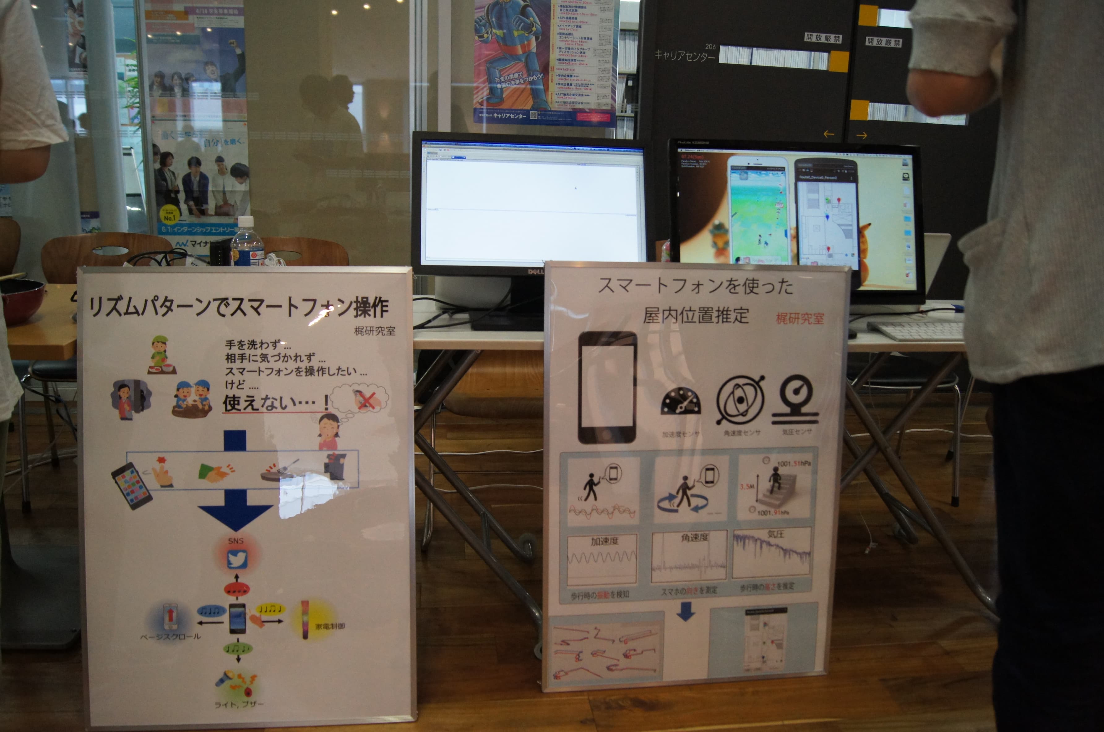 2016年7月23,24日に愛知工業大学オーブンキャンパスが開催されました. 梶研でもpdr班とリズム班が成果物を展示しました. PDR班では最近話題のあのゲームを使った作戦が刺さり,多くの方に見学していただきました. GPSでは出来ない屋内位置推定のメリットを上手く説明できたと思います. リズム班では来てくださった方々にリズム認証アプリを実際に体験していただきました. 体験者からは「これ欲しい」などの声もあり,リズム認証でアプリを操作することの便利さを伝えることができました.