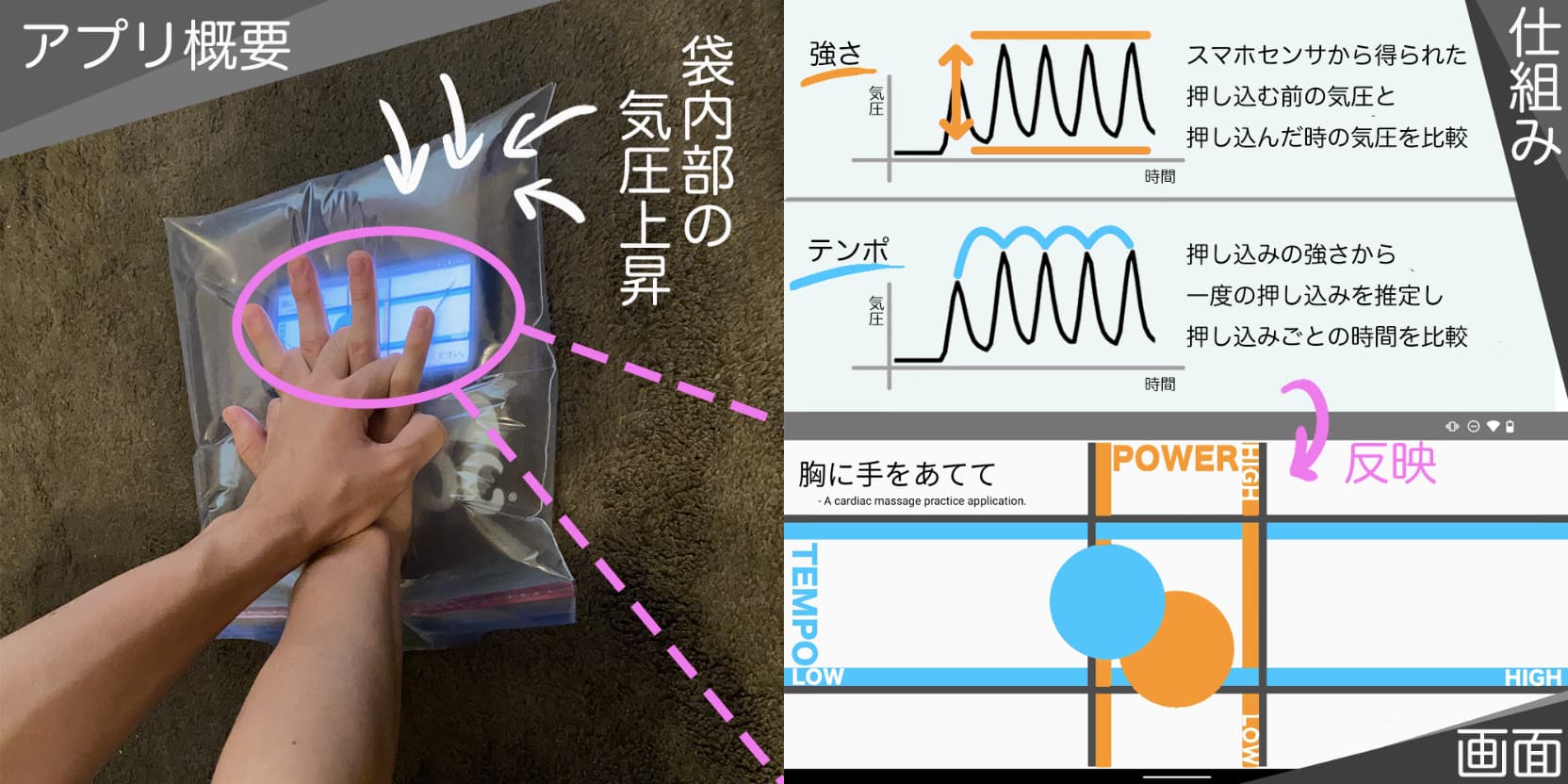 毎年多くの方が,心停止によって亡くなっている. その中には外出時に突然倒れてしまうケースも少なくない. その際重要になるのが,心臓マッサージ等の一次救命措置である. しかし,市民が倒れる瞬間を目撃したケースでも一次救命措置の実施率は6割にとどまっている,その原因を調査すると一次救命措置への知識・経験の不足が目立つ結果となった. そこでどうすれば一次救命措置未実施が減らせるかを考え,心臓マッサージの練習に着目した. 現状練習するにはどうしても心臓マッサージ用の人形が必要であり,コストが高いという問題がある. そこで“スマートフォンの気圧センサと身近にある密封できる袋を使えば今までよりも手軽に心臓マッサージの練習ができるのではないか“と考え心臓マッサージ練習アプリを制作している. 現在のアプリの機能としては,リアルタイムに練習できるモノと自分の心臓マッサージをテストできるモノがある.