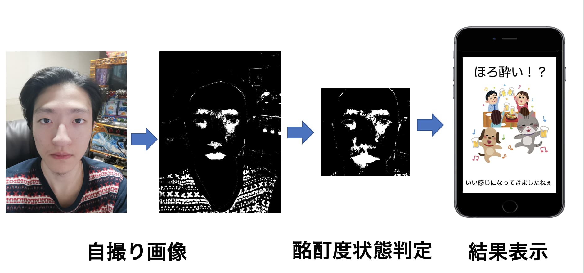 飲み会を行う機会は多々ある,例として忘年会や懇親会など種類は様々だ. その中でスマホの普及などによって,気軽に写真撮影ができるようになったことで飲み会の様子を撮影する機会が増えた. しかし,飲み会の問題点として,会話が盛り上がらない,飲み過ぎによる体調異常,アルコールハラスメントが挙げられる. 本アプリは,飲み会などのお酒を飲む機会で自撮りを行い,自分がどの程度酔っているかを判定し視覚的に状態がわかるので,コミュニケーション促進や飲み過ぎ防止を手助けするアプリです. まず,どの程度酔っているか判定する要素として. 人はアルコールを摂取するとふらついたり,顔が赤くなったり様々な症状が現れます. 本アプリでは顔が赤くなる症状を利用しています. 最後に,アプリの仕組みとして,自撮りを行い,その画像から顔の赤みを抽出します. 抽出した,赤みの値を参考にして,独自に収集した,顔の赤みとアルコールの相関と比較,酔いの状態を判定し,アプリ画面に判定結果を表示します.