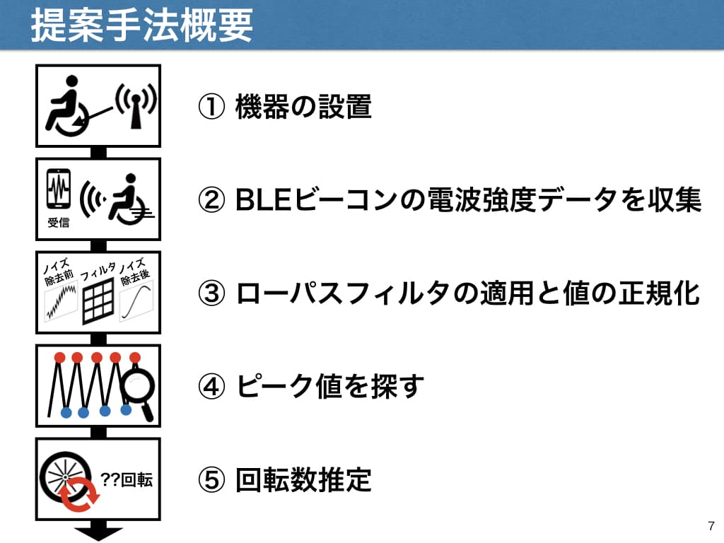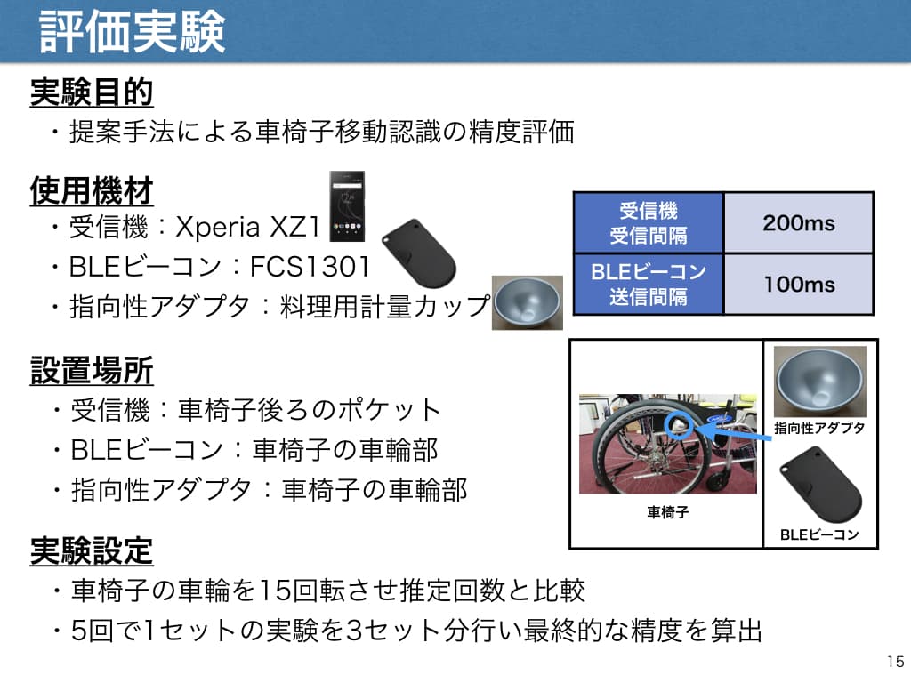 そこで本研究では,複数の状態を持つモノの状態推定を目的とし,その代表例として車椅子を用いることで「BLEビーコンを用いた車椅子の移動認識」を目指しました.