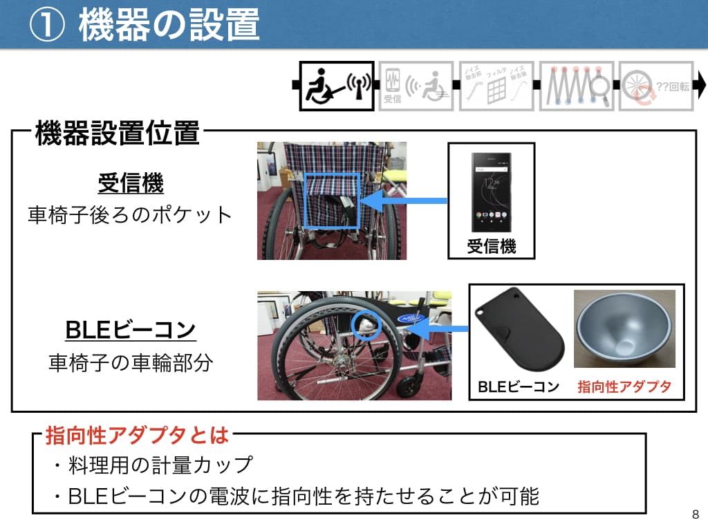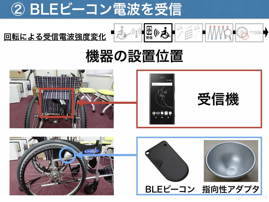 まず最初に移動を推定したい車椅子にBLEビーコンと受信機を設置します.