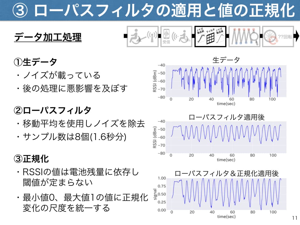 そして,BLEビーコンの電波強度データを収集し,ノイズを軽減するため取得データに対してローパスフィルタの適用と値の正規化を行います.