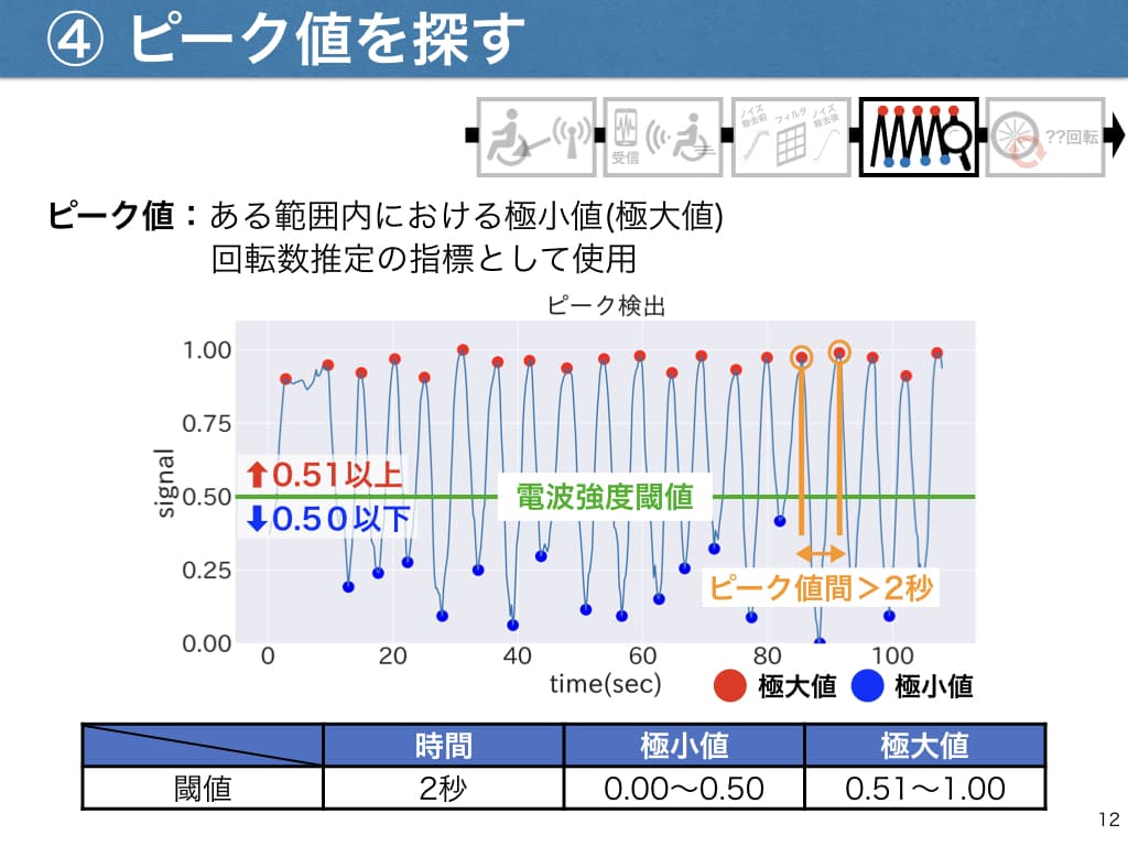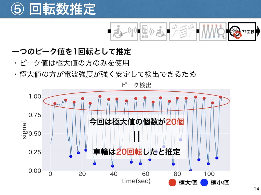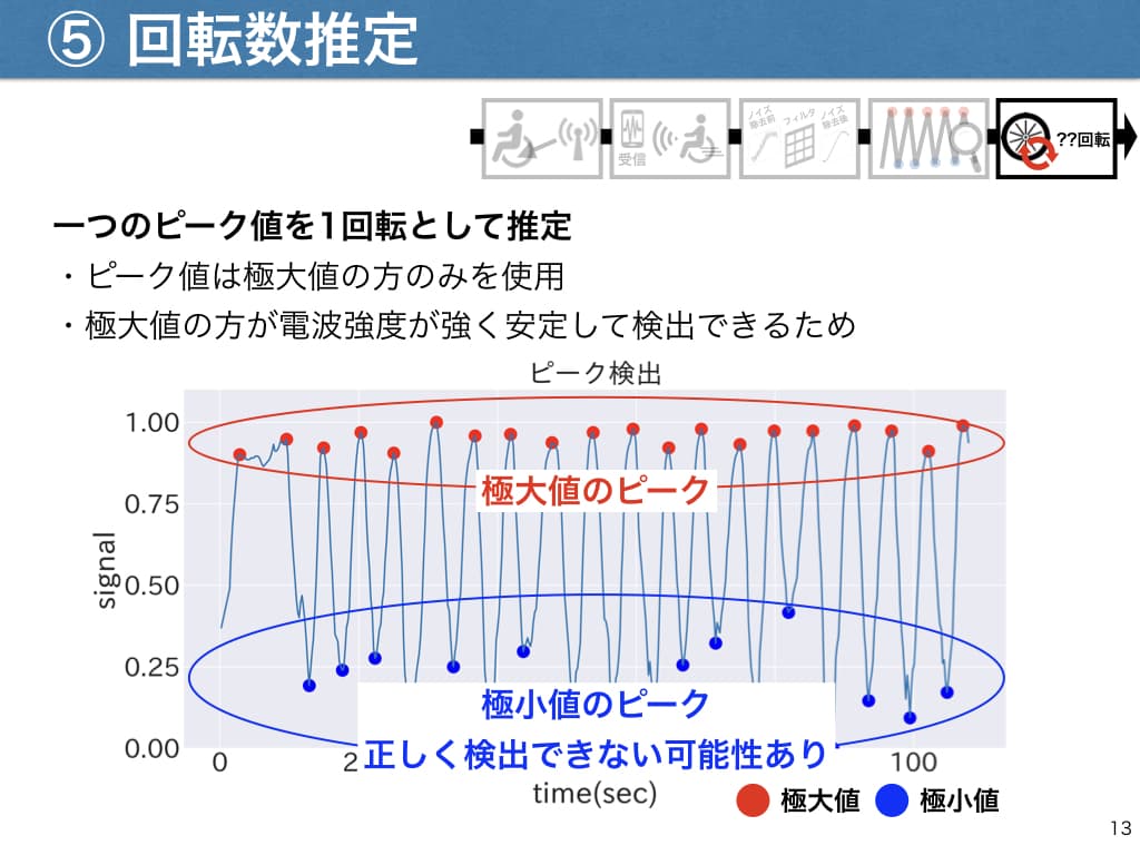 次に,ノイズを軽減したデータの中からピーク値を探し,最後にその情報をもとに車輪の回転数を推定します.