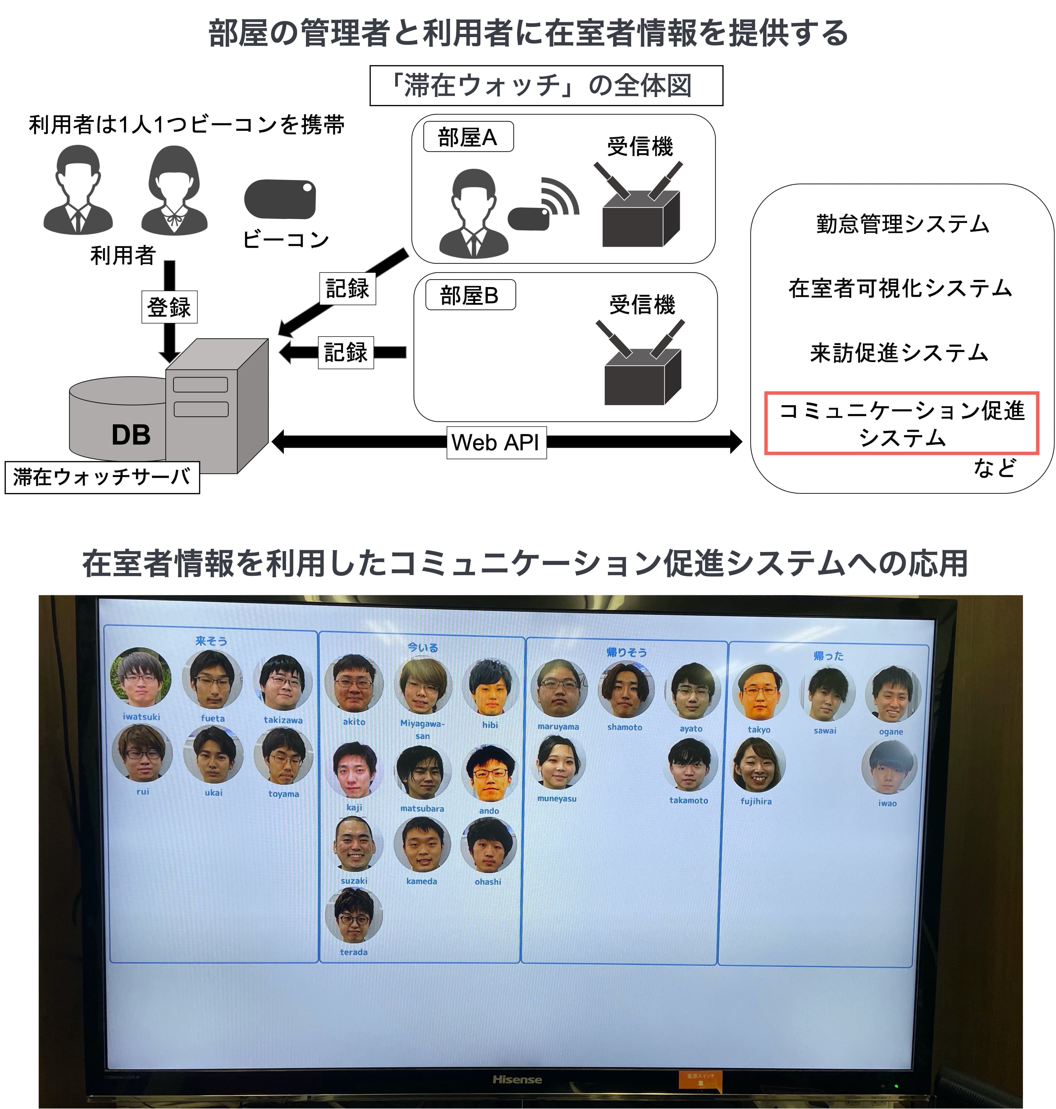 研究室のような場所では活発なコミュニケーションが求められるが,コアタイムがない研究室では常に活発なコミュニケーションがあるとは限らない. 我々はBLEビーコンを用いた在室管理プラットフォーム「滞在ウォッチ」を提案する. ビーコンを持った利用者が部屋に訪れると受信機が検知し,サーバに在室者情報を送信しデータベースに記録する. 「滞在ウォッチ」が記録した在室者情報を用いてコミュニケーション促進システムの構築をする. “来そう“,”今いる“,”帰りそう“,”帰った“の4種類に分類して,研究室のディスプレイに利用者の顔写真を提示する. 分類された在室者状況を見るとコミュニケーションが発生すると考えられる.